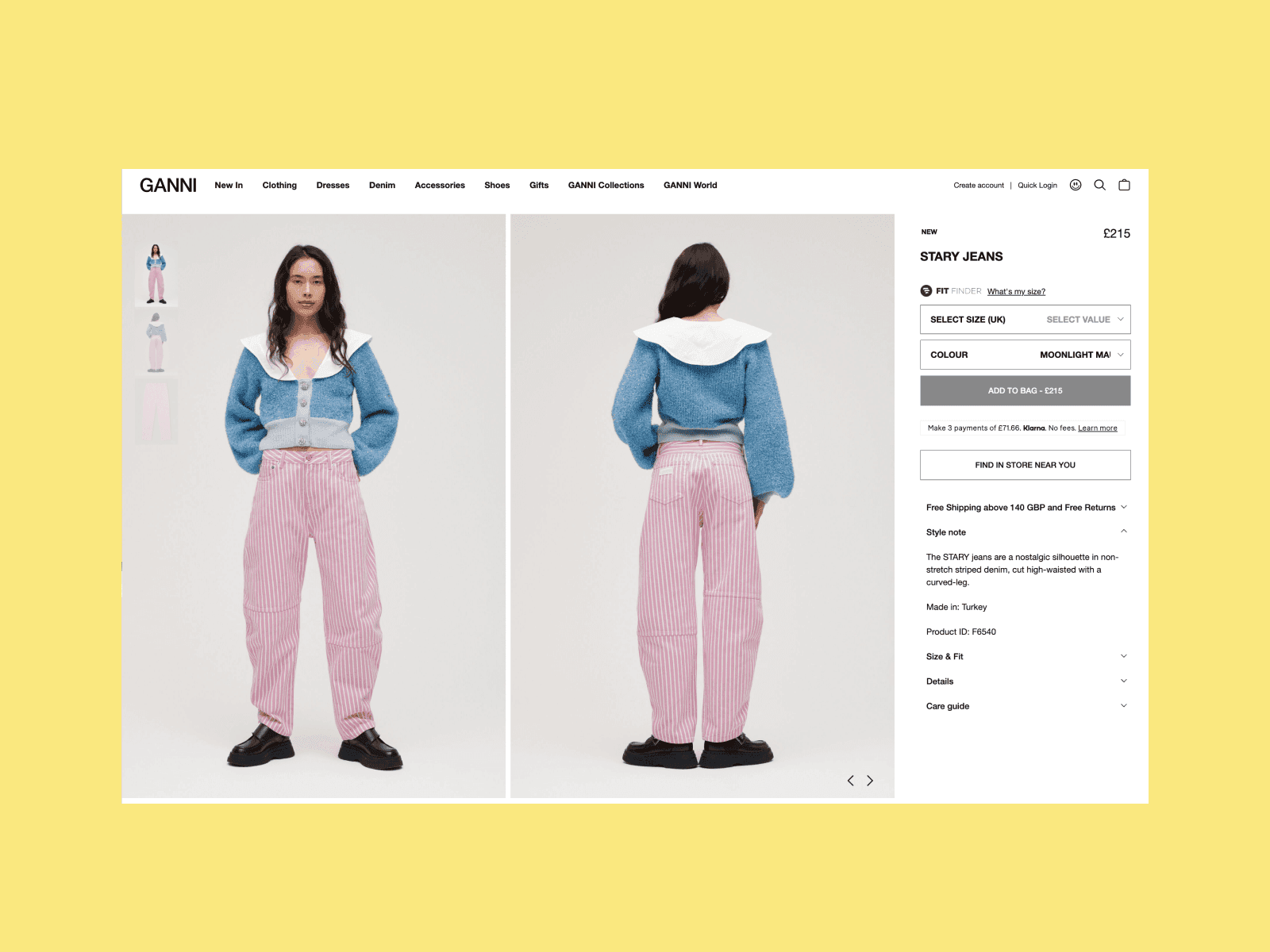With a mission to spread Scandinavian cool globally, Ganni is renowned for its bold identity, easygoing style, and refined high street presence. Seeking a web presence that aligns with their distinctive ethos and international aspirations, we were tasked to craft a user-friendly website appealing to both existing and new customers.